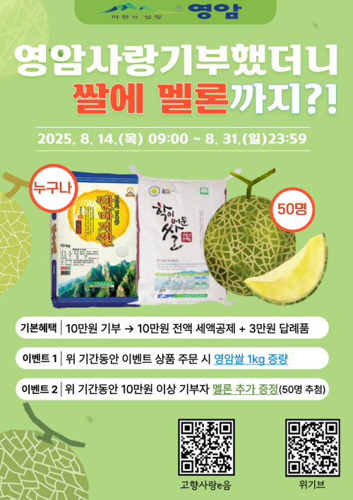 ¿µ¾Ï±º¿¡ °íÇâ»ç¶û±âºÎ±ÝÀ» ±âºÎÇϰí, ¿µ¾Ï½ÒÀÎ ´Þ¸¶Áö½Ò, ÇÐÀ̸ӹ®½Ò 10kgÀ» ´ä·ÊǰÀ¸·Î ÁÖ¹®ÇÏ¸é ±âºÎ ±â°£¿¡ »ó°ü¾øÀÌ 1kgÀ» Ãß°¡ Áõ·®ÇØ ÁÖ°í, Ưº° À̺¥Æ® ±â°£ ³» ±âºÎÀÚ Áß 50¸íÀ» µû·Î ÃßÃ·ÇØ ¸á·ÐÀ» ÁõÁ¤ÇÏ´Â ³»¿ëÀÌ´Ù.