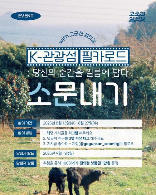 8¿ù °í±º»ê¼¶ÀÕ±æ ´Ù´ÞÀÌ À̺¥Æ® ¡¯K-°ü±¤¼¶ ÇÊÄ«·Îµå Çà»ç ¼Ò¹®³»±â¡¯¿¡ Âü¿©ÇÏ·Á¸é, °í±º»ê¼¶ÀÕ±æ °ø½Ä »çȸ°ü°è¸Á(SNS)À» ÆÈ·Î¿ì ÇÑ ÈÄ ´ñ±Û¿¡ Ä£±¸¸¦ ¼ÒȯÇϰí, ÇØ´ç °Ô½Ã¹°À» ¸®±×·¥ÇÏ¸é µÈ´Ù.