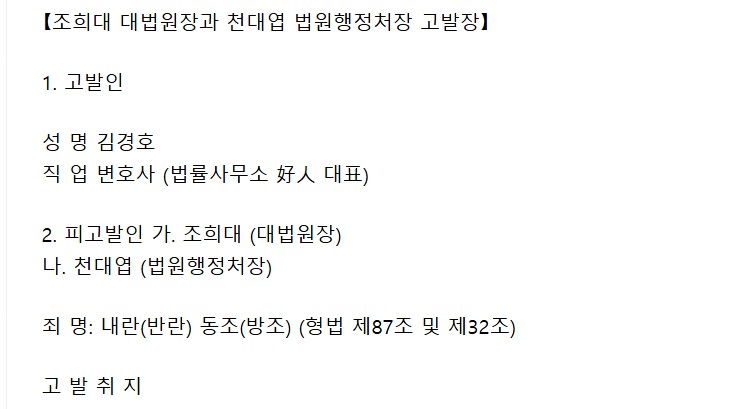 À̹ø °í¹ßÀº Á¶Èñ´ë ´ë¹ý¿øÀå°ú õ´ë¿± ¹ý¿øÇàÁ¤Ã³ÀåÀÌ À±¼®¿­ ¼¼·ÂÀÇ ³»¶õ(¹Ý¶õ) ÇàÀ§¸¦ µ½°í, Á¤ÀÇÀÇ ½ÇÇöÀ» ¹æÇØÇß´Ù´Â ÇøÀǸ¦ ´ã°í ÀÖÀ¸¸ç, °í¹ßÀÎÀÌ ÁÖÀåÇÏ´Â ÇÙ½É ³»¿ëÀº ´ÙÀ½ÀÇ ¼¼ °¡Áö·Î,