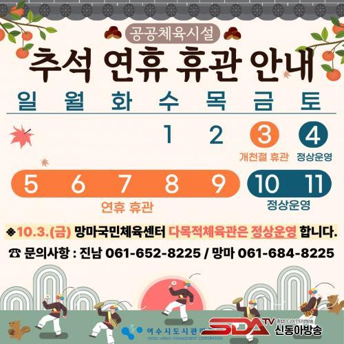 ´Ù¸¸, ¿¬ÈÞ Àü °³ÃµÀýÀÎ 10¿ù 3ÀÏ(±Ý)¿¡´Â ¸Á¸¶±¹¹ÎüÀ°¼¾ÅÍ ´Ù¸ñÀûüÀ°°ü¸¸ ¿î¿µÇϸç, 10¿ù 4ÀÏ(Åä)¿¡´Â Áø³²¼ö¿µÀå°ú ¸Á¸¶±¹¹ÎüÀ°¼¾ÅͰ¡ Á¤»ó ¿î¿µµÈ´Ù.