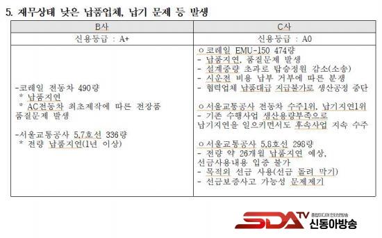 ¶Ç ´Ù¸¥ ¹®Á¦´Â ÀÌ °°Àº ºÎ½Ç Æò°¡ÀÇ °á°ú, °ø°ø»ç¾÷ ³³Ç° Â÷ÁúÀÌ ÀÕµû¸£°í ÀÖ´Ù´Â Á¡ÀÌ´Ù. ¾Õ¼ ¾ð±ÞµÈ B»ç´Â ÄÚ·¹ÀÏ Àüµ¿Â÷ 490·®À» Á¦¶§ ³³Ç°ÇÏÁö ¸øÇßÀ¸¸ç, ¼¿ï±³Åë°ø»ç Àüµ¿Â÷ 336·®Àº 1³â ³Ñ°Ô ¹Ì³³µÈ »óÅ´Ù. ¶Ç, ´Ù¸¥ C»ç´Â EMU-150 Àüµ¿Â÷ 474·® ³³Ç°ÀÌ Áö¿¬µÅ ¹ýÀû ºÐÀïÀ¸·Î À̾îÁ³°í, ¼±±Ý »ç¿ë ³»¿ªµµ ºÒÅõ¸íÇØ °¨»ç°¡ ÁøÇà ÁßÀÎ °ÍÀ¸·Î ¾Ë·ÁÁ³´Ù.