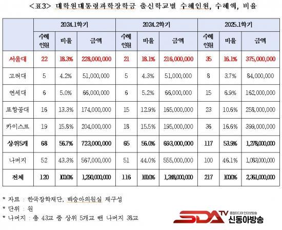¡à ±¹È¸ ±³À°À§¿øÈ¸ ¹é½Â¾Æ ÀÇ¿ø(´õºÒ¾î¹ÎÁÖ´ç)ÀÌ Çѱ¹ÀåÇÐÀç´ÜÀ¸·ÎºÎÅÍ Á¦Ãâ¹ÞÀº ¡®±¹°¡¿ì¼öÀåÇÐ±Ý ¼öÇý ÇöȲ¡¯ ÀÚ·á¿¡ µû¸£¸é, ¿ÃÇØ 1Çб⠴ëÅë·É°úÇÐÀåÇбÝÀ» ¹ÞÀº 397¸í Áß °ú¹ÝÀÎ 207¸í(52.1%)ÀÌ ¼¿ï´ë»ýÀ̾ú´Ù. ¼¿ï´ë ´ÙÀ½À¸·Î ¼öÇýÇлýÀÌ ¸¹Àº Ä«À̽ºÆ®(28¸í¡¤7.1%)º¸´Ù 179¸íÀ̳ª ¸¹¾Æ ¼¿ï´ë·ÎÀÇ ÀåÇÐ±Ý ¼öÇý ½ò¸²ÀÌ Å« °ÍÀ¸·Î ³ªÅ¸³µ´Ù.