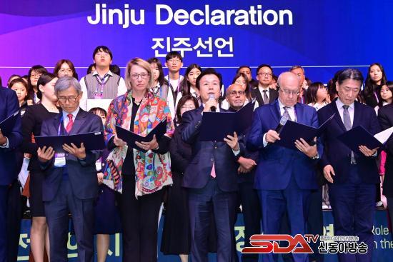 ÁøÁÖ ¼±¾ð¿¡´Â Á¶±ÔÀÏ ÁøÁÖ½ÃÀå, ¿ÀÁØ ÁøÁÖ K-±â¾÷°¡Á¤½Å ±¹Á¦Æ÷·³ Á¶Á÷À§¿øÀå, ¾á Ä«¹Ý Á¦57Â÷ À¯¿£ÃÑȸ ÀÇÀå, ½ºÆ©¾îÆ® ·¹ÀÌÇÊµå ¹Ì±¹ ÄÝ·³¹ö½º ÁÖ¸³´ëÇб³ ÃÑÀå, ÆúÂù ¸»·¹ÀÌ½Ã¾Æ ÇïÇÁ´ëÇб³ ÃÑÀå, µ¥À̺ñµå ½ºÇÁ·ÎÆ® ¹Ì±¹ ÇÇÅÍ µå·¯Ä¿ °æ¿µ´ëÇпø ÇÐÀå, ¾ÆÀ̸¸ Ÿ¶óºñ½¬ ICSB ȸÀå, ±è±âÂù ICSB ÇÐȸÀå µî ±¹³»¿Ü ÁÖ¿ä Àλç, ´ëÇлý µî 18¸íÀÌ ´ëÇ¥·Î Âü¿©ÇÏ¿© ¡®ÁøÁÖ ¼±¾ð¹®¡¯À» ³¶µ¶Çß´Ù.