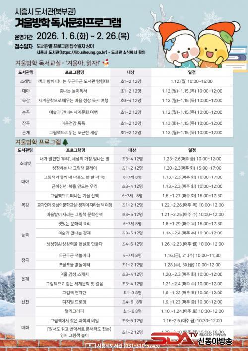 [½Åµ¿¾Æ¹æ¼Û ½ÃÈï½Ã=À̽ŵ¿±âÀÚ] ½ÃÈï½Ã´Â °Ü¿ï¹æÇÐÀ» ¸Â¾Æ ºÏºÎ±Ç 8°³ °ø°øµµ¼­°ü(¼Ò·¡ºû¤ý´ë¾ß¤ý¸ñ°¨¤ý´É°î¤ýÀå°î¤ýÀº°è¤ý½Åõ¤ý¸ÅÈ­)¿¡¼­ 1¿ù 6ÀϺÎÅÍ 2¿ù 26ÀϱîÁö °Ü¿ïµ¶¼­±³½Ç ¹× °Ü¿ï¹æÇÐ ÇÁ·Î±×·¥À» ¿î¿µÇÑ´Ù.