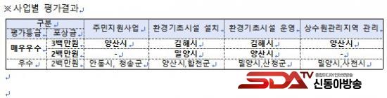 ÁöÀÚüº° Áֿ伺°ú·Î´Â, ¾ç»ê½Ã´Â ÁÖ¹ÎÁö¿ø»ç¾÷, ȯ°æ±âÃʽü³ ¿î¿µ»ç¾÷, »ó¼ö¿ø°ü¸®Áö¿ª °ü¸®»ç¾÷ µî 3°³ ºÐ¾ß¿¡¼ ¡®¸Å¿ì¿ì¼ö¡¯ µî±ÞÀ» ¹Þ¾ÒÀ¸¸ç, ±èÇØ½Ã´Â ȯ°æ±âÃʽü³ ¼³Ä¡ »ç¾÷°ú ȯ°æ±âÃʽü³ ¿î¿µ »ç¾÷ 2°³ ºÐ¾ß¿¡¼ ¡®¸Å¿ì¿ì¼ö¡¯ µî±ÞÀ» ¹Þ¾Ò´Ù.