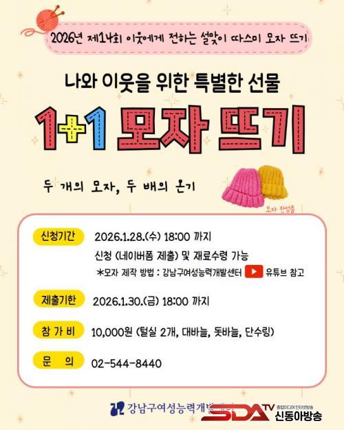 ÀÌ Çà»ç´Â °³²±¸¿©¼º´É·Â°³¹ß¼¾ÅÍ ÇнÀµ¿¾Æ¸® ȸ¿øµéÀÌ 2013³â ÀÚ¹ßÀûÀ¸·Î ½ÃÀÛÇØ ¿ÃÇØ·Î 14ȸ°¸¦ ¸Â´Â´Ù. Áö³ÇØ¿¡´Â 241°³ÀÇ ¸ðÀÚ¸¦ Ãë¾à°èÃþ¿¡°Ô ¼±¹°Çß´Ù. Âü°¡¸¦ ½ÅûÇÏ¸é µÎ °³ÀÇ ½Ç·Î Çϳª´Â ¼Ò¿ÜµÈ ÀÌ¿ôÀ» À§ÇÑ ¼±¹°À», ´Ù¸¥ Çϳª´Â ÀÚ½ÅÀ» À§ÇÑ ¸ðÀÚ¸¦ Á¦ÀÛÇÏ¿© ÀÌ¿ô¿¡°Ô µû¶æÇÑ ¿ÂÁ¤À» ³ª´©´Â ¼ÒÁßÇÑ ½Ã°£À» º¸³¾ ¼ö ÀÖ´Ù.