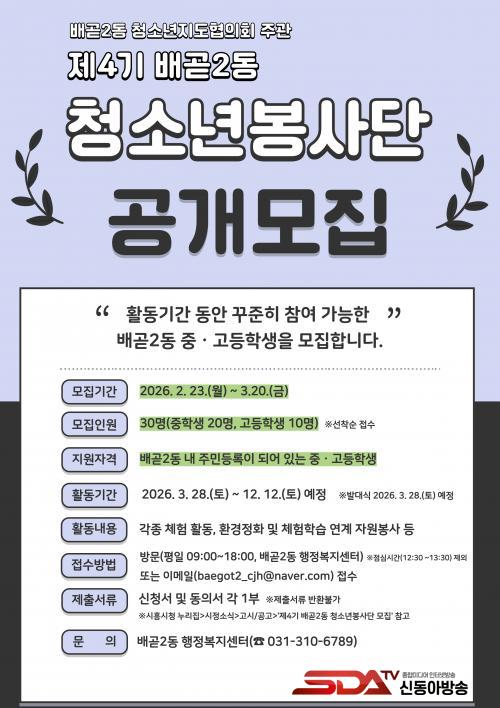 Á¦4±â û¼Ò³âºÀ»ç´ÜÀº ¼±Âø¼øÀ¸·Î ¼±¹ßÇϸç, 3¿ù 28ÀϺÎÅÍ 12¿ù 12ÀϱîÁö ¸Å¿ù 1~2ȸ Ȱµ¿ÇÏ°Ô µÈ´Ù. ÁÖ¿ä Ȱµ¿Àº °¢Á¾ üÇè ÇÁ·Î±×·¥, ȯ°æÁ¤È ¹× üÇèÇнÀ ¿¬°è ÀÚ¿øºÀ»ç, ¹è°ð2µ¿ ÃàÁ¦¿Í Çà»ç Âü¿© µîÀÌ´Ù.