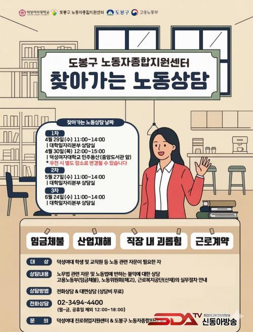 [½Åµ¿¾Æ¹æ¼Û µµºÀ±¸=À̽ŵ¿±âÀÚ] ¼­¿ï µµºÀ±¸ ³ëµ¿ÀÚÁ¾ÇÕÁö¿ø¼¾ÅÍ(ÀÌÇÏ ¼¾ÅÍ)°¡ 4~6¿ù ´ö¼º¿©ÀÚ´ëÇб³¿Í ¿¬°èÇØ ´ëÇлý°ú ¿¹ºñ³ëµ¿ÀÚ¸¦ À§ÇÑ ¡®Ã£¾Æ°¡´Â ³ëµ¿»ó´ã¡¯À» ÁøÇàÇÑ´Ù°í ¹àÇû´Ù.