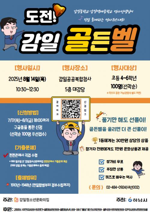 [½Åµ¿¾Æ¹æ¼Û Çϳ²½Ã=À̽ŵ¿±âÀÚ] Çϳ²½Ã °¨ÀÏû¼Ò³â¹®È­ÀÇÁýÀÌ ±¤º¹ÀýÀ» ±â³äÇØ °¨Àϵ¿ û¼Ò³âµé°ú ÇÔ²²Çϴ Ưº°ÇÑ ¿ª»ç ÄûÁî´ëȸ¡®µµÀü! °¨ÀÏ °ñµçº§¡¯À» °³ÃÖÇÑ´Ù. À̹ø Çà»ç´Â 8¿ù 14ÀÏ(¸ñ) ¿ÀÀü 10½Ã 30ºÐ, °¨Àϰø°øº¹ÇÕû»ç 5Ãþ ´ë°­´ç¿¡¼­ ¿­¸°´Ù. Çϳ²½Ã°¡¡¦