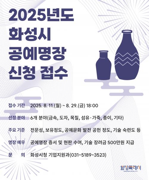 [½Åµ¿¾Æ¹æ¼Û=ÀÌÀçö±âÀÚ] È­¼ºÆ¯·Ê½Ã(½ÃÀå Á¤¸í±Ù)°¡ ÀüÅë °ø¿¹ ±â¼úÀÇ °è½Â°ú ¹ßÀüÀ» À§ÇØ 2025³âµµ È­¼ºÆ¯·Ê½Ã °ø¿¹¸íÀåÀ» ¼±¹ßÇÑ´Ù°í 5ÀÏ ¹àÇû´Ù. ¿ÃÇØ´Â ±Ý¼Ó, µµÀÚ, ¸ñÄ¥, ¼¶À¯¡¤°¡Á×, Á¾ÀÌ, ±âŸ µî 6°³ °ø¿¹ ºÐ¾ß¿¡¼­ ÃÑ 2¸íÀ» ¼±Á¤ÇÑ´Ù. ÀÚ°Ý¿ä°ÇÀÎ ¡ãÇØ¡¦