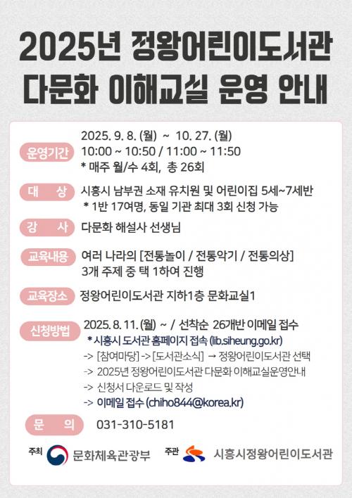 [½Åµ¿¾Æ¹æ¼Û ½ÃÈï½Ã=À̽ŵ¿±âÀÚ] ½ÃÈï½ÃÁ¤¿Õ¾î¸°À̵µ¼­°üÀº ¿À´Â 9¿ù 8ÀϺÎÅÍ 10¿ù 27ÀϱîÁö °ü³» À¯¾Æ±³À°±â°ü¿¡ µî¿ø ÁßÀÎ 5~7¼¼ ¾î¸°À̸¦ ´ë»óÀ¸·Î ¡®2025³â ÇϹݱ⠴ٹ®È­ ÇÁ·Î±×·¥¡¯ÀÇ ÀÏȯÀÎ ¡®´Ù¹®È­ ÀÌÇØ±³½Ç¡¯À» ¿î¿µÇÑ´Ù. ¼ö¾÷Àº Á¤¿Õ¾î¸°À̵µ¼­°ü ÁöÇÏ 1Ãþ¡¦
