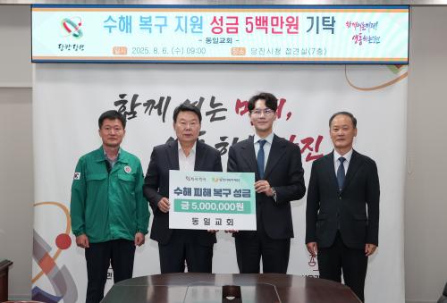 [½Åµ¿¾Æ¹æ¼Û=ÀÌÀçö±âÀÚ] µ¿Àϱ³È¸(´ãÀÓ¸ñ»ç À̼öÈÆ)°¡ ´çÁø Áö¿ªÀÇ ÁýÁßÈ£¿ì ÇÇÇØ º¹±¸¸¦ À§ÇØ ¼º±Ý 500¸¸ ¿øÀ» ±âŹÇß´Ù. ±âʽÄÀº 8¿ù 6ÀÏ ¿ÀÀü ´çÁø½Ãû 7Ãþ Á¢°ß½Ç¿¡¼­ ÁøÇàµÆÀ¸¸ç, µ¿Àϱ³È¸ ÀÌ»ó±¸ ºÎ¸ñ»ç°¡ Âü¼®ÇØ ´çÁø½Ã¿¡ ¼º±ÝÀ» Àü´ÞÇß´Ù. µ¿Àϱ³È¸´Â 1¡¦