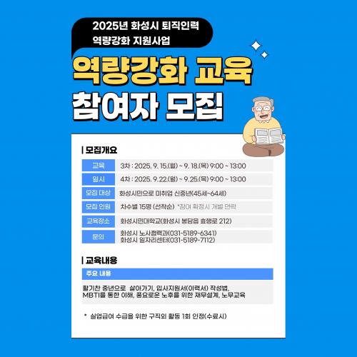 [½Åµ¿¾Æ¹æ¼Û=ÀÌÀçö±âÀÚ] È­¼ºÆ¯·Ê½Ã(½ÃÀå Á¤¸í±Ù)°¡ ÅðÁ÷ ÀηÂÀÇ »çȸ ÀçÁøÃâ°ú ³ëÈÄ Áغñ¸¦ µ½±â À§ÇÑ ¿ª·®°­È­ ±³À° 3¡¤4±â Âü¿©ÀÚ¸¦ ¼±Âø¼ø ¸ðÁýÇÑ´Ù°í 14ÀÏ ¹àÇû´Ù. À̹ø ±³À°Àº ¡®2025³â È­¼º½Ã ÅðÁ÷Àη ¿ª·®°­È­ Áö¿ø»ç¾÷ : ½ÅÁß³â Á¡ÇÁ¾÷ ÇÁ·ÎÁ§Æ®¡¯ÀÇ ÀÏȯÀ¸¡¦