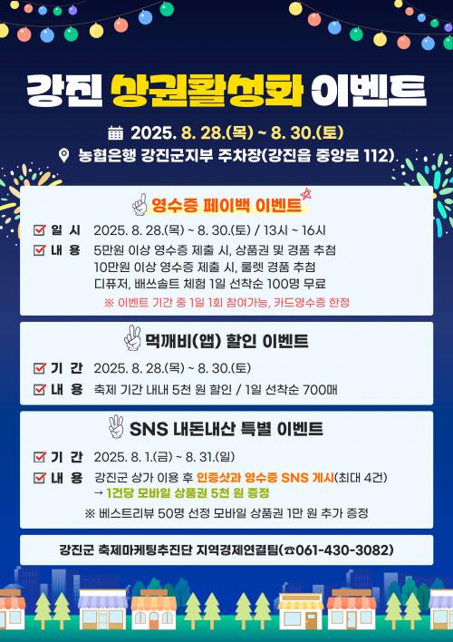 [½Åµ¿¾Æ¹æ¼Û Àü³²°­Áø=°­Áø±ºÀÌ Á¦3ȸ ÇϸÆÃàÁ¦ ±â°£ Áß °­Áø »ó°¡ Ȱ·ÂÀ» À§ÇØ ¿À´Â 8¿ù 28ÀÏ ¸ñ¿äÀϺÎÅÍ 30ÀÏ Åä¿äÀϱîÁö 3Àϰ£ ³óÇùÀºÇà °­Áø±ºÁöºÎ ÁÖÂ÷Àå(°­ÁøÀ¾ Áß¾Ó·Î 112)¿¡¼­ ¿ÀÈÄ 1½Ã ~ 4½Ã±îÁö °­Áø »ó±ÇȰ¼ºÈ­ À̺¥Æ®¸¦ ÃßÁøÇÑ´Ù. À̹ø À̺¥Æ®´Â »ó°¡ ¹æ¡¦