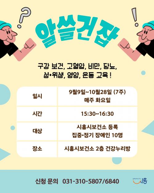 [½Åµ¿¾Æ¹æ¼Û ½ÃÈï½Ã=À̽ŵ¿±âÀÚ] ½ÃÈï½Ã´Â ¿À´Â 9¿ù 9ÀϺÎÅÍ 10¿ù 28ÀϱîÁö °ü³» Àå¾ÖÀÎÀÇ °Ç°­°ü¸®¸¦ µ½±â À§ÇØ ¡®¾Ë¾µ°ÇÀâ(¾Ë¾ÆµÎ¸é ¾µ¸ð ÀÖ´Â °Ç°­ ÀâÇлçÀü)¡¯ ÇÁ·Î±×·¥À» ½ÃÈï½Ãº¸°Ç¼Ò 2Ãþ °Ç°­´©¸®¹æ¿¡¼­ ¿î¿µÇÑ´Ù. À̹ø ÇÁ·Î±×·¥Àº ½ÃÈï½Ã º¸°Ç¼Ò¿¡ µî·ÏµÈ À塦