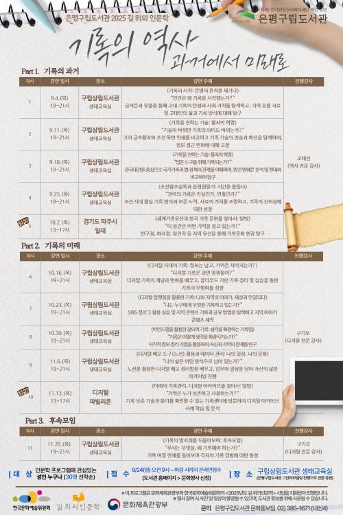 [½Åµ¿¾Æ¹æ¼Û ÀºÆò±¸=À̽ŵ¿±âÀÚ] ¼­¿ï ÀºÆò±¸´Â ÀºÆò±¸¸³µµ¼­°üÀÌ ¿À´Â 4ÀϺÎÅÍ 11¿ù 20ÀϱîÁö ¸ÅÁÖ ¸ñ¿äÀÏ, ±â·Ï¹®È­ÀÇ È帧À» µû¶ó Àΰ£°ú °øµ¿Ã¼ÀÇ »îÀ» ¼ºÂûÇÏ´Â Àι®ÇÐ ÇÁ·Î±×·¥ ¡®±â·ÏÀÇ ¿ª»ç, °ú°Å¿¡¼­ ¹Ì·¡·Î : µ¹º®¿¡ »õ±ä ¹®ÀÚ¿¡¼­ ÀΰøÁö´É±îÁö¡¯¸¦ ¿î¿µÇÑ´Ù¡¦