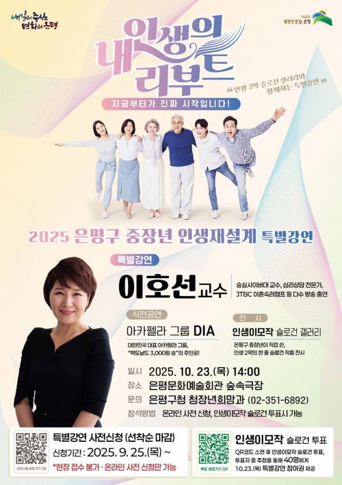 [½Åµ¿¾Æ¹æ¼Û ÀºÆò±¸=À̽ŵ¿±âÀÚ] ¼­¿ï ÀºÆò±¸´Â ³»´Þ 23ÀÏ ¿ÀÈÄ 2½Ã ÀºÆò¹®È­¿¹¼úȸ°ü ½£¼Ó±ØÀå¿¡¼­ ¡®ÀÌÈ£¼± ±³¼ö ÃÊû ÁßÀå³â ÀλýÀç¼³°è Ưº°°­¿¬¡¯À» °³ÃÖÇÑ´Ù°í ¹àÇû´Ù. °­¿¬Àº ¡®³» ÀλýÀÇ ¸®ºÎÆ® – Áö±ÝºÎÅͰ¡ ÁøÂ¥ ½ÃÀÛÀÔ´Ï´Ù!¡¯¸¦ ÁÖÁ¦·Î, ÅðÁ÷À̳ª ÀÚ¡¦