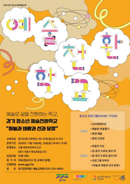 [½Åµ¿¾Æ¹æ¼Û ½ÃÈï½Ã=À̽ŵ¿±âÀÚ] ½ÃÈï½Ã´Â ¸ñ°¨¾ÆÆ®ÇϿ콺27¿¡¼­ ÁøÇàµÇ´Â °æ±â û¼Ò³â ¿¹¼úÀüȯÇб³ ¡®Çϴðú ¹Ù¶÷°ú ¼±°ú ¹®À塯 Âü¿©ÀÚ¸¦ ¸ðÁýÇÑ´Ù. À̹ø ÇÁ·Î±×·¥Àº ¿À´Â 11¿ù 13Àϰú 15ÀÏ ÀÌÆ²°£ ¸ñ°¨¾ÆÆ®ÇϿ콺27 ÀÏ´ë¿¡¼­ ¿­¸®¸ç, ¡®³¯¾¾¿Í ȯ°æ¡¯À» ÁÖÁ¦·Î ¡¦