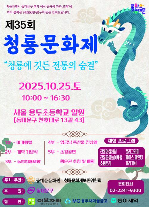 [½Åµ¿¾Æ¹æ¼Û µ¿´ë¹®±¸=À̽ŵ¿±âÀÚ] ¼­¿ï µ¿´ë¹®±¸´Â ¿À´Â 25ÀÏ ¿ëµÎÃʵîÇб³ ¿îµ¿Àå¿¡¼­¡¸Á¦35ȸ û·æ¹®È­Á¦¡¹¸¦ °³ÃÖÇÑ´Ù°í ¹àÇû´Ù. À̹ø Çà»ç´Â µ¿´ë¹®¹®È­¿ø°ú û·æ¹®È­Á¦º¸Á¸À§¿øÈ¸°¡ °øµ¿ ÁÖ°üÇϰí, µ¿´ë¹®±¸°¡ ÈÄ¿øÇÑ´Ù. ¡®Ã»·æ¹®È­Á¦¡¯´Â Á¶¼± Á¦3´ë ÀÓ±Ý ÅÂÁ¾¡¦