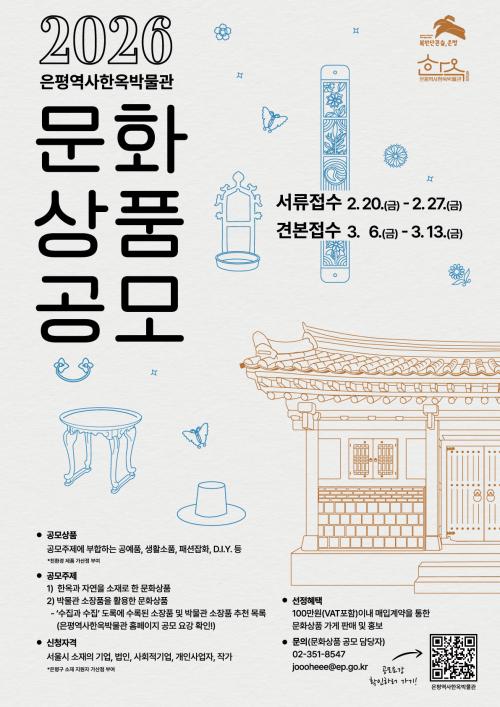 [½Åµ¿¾Æ¹æ¼Û ÀºÆò±¸=À̽ŵ¿±âÀÚ] ¼­¿ï ÀºÆò±¸´Â ¿À´Â 2¿ù 20ÀϺÎÅÍ ¡®2026 ÀºÆò¿ª»çÇÑ¿Á¹Ú¹°°ü ¹®È­»óǰ °ø¸ðÀü¡¯À» °³ÃÖÇÑ´Ù°í ¹àÇû´Ù. À̹ø °ø¸ðÀüÀº ÀºÆòÇÑ¿Á¸¶À»ÀÇ ¶Ù¾î³­ ÀÚ¿¬ °æ°ü°ú ÇÑ¿ÁÀÇ °¡Ä¡¸¦ ³Î¸® ¾Ë¸®±â À§ÇØ ¸¶·ÃµÆ´Ù. ÁÖÁ¦´Â ÇÑ¿Á°ú ÀÚ¿¬À» ¼ÒÀç·Î ÇÑ¡¦