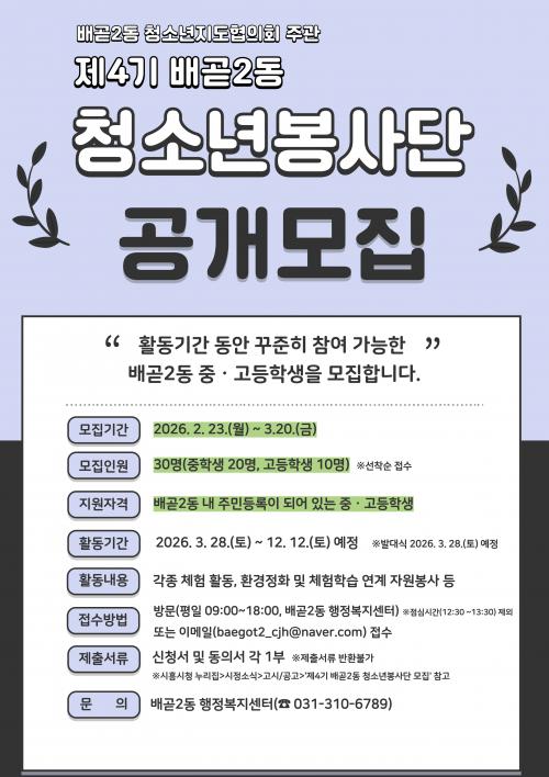 [½Åµ¿¾Æ¹æ¼Û ½ÃÈï½Ã=À̽ŵ¿±âÀÚ] ½ÃÈï½Ã ¹è°ð2µ¿ û¼Ò³âÁöµµÇùÀÇȸ´Â ÀÚ¿øºÀ»ç¿Í ´Ù¾çÇÑ Ã¼ÇèȰµ¿¿¡ Âü¿©ÇÒ Á¦4±â ¹è°ð2µ¿ û¼Ò³âºÀ»ç´Ü¿øÀ» ¸ðÁýÇÑ´Ù. ¹è°ð2µ¿ û¼Ò³âÁöµµÇùÀÇȸ´Â Áö¿ª û¼Ò³âÀÌ ÀÚ¿øºÀ»ç¿Í üÇèȰµ¿À» ÅëÇØ ÀÇ¹Ì ÀÖ´Â ½Ã°£À» º¸³»°í, Áö¿ª»çȸ ±¸¼º¡¦