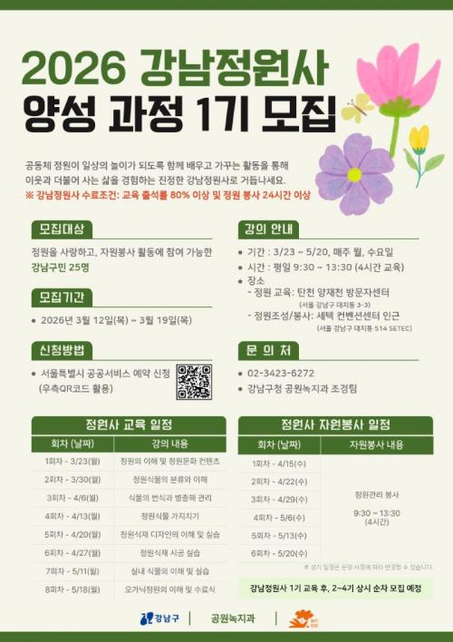 [½Åµ¿¾Æ¹æ¼Û °­³²±¸=À̽ŵ¿±âÀÚ] ²ÞÀÌ ¸ðÀÌ´Â µµ½Ã, ¹Ì·¡¸¦ ±×¸®´Â °­³²±¸(±¸Ã»Àå Á¶¼º¸í)°¡ »ýȰ±Ç °ø¿ø°ú ³ìÁö °ü¸® ¼ö¿ä Áõ°¡¿¡ ´ëÀÀÇØ Àü¹®¼ºÀ» °®Ãá ½Ã¹Î ÀηÂÀ» ¾ç¼ºÇÏ´Â ¡®°­³²Á¤¿ø»ç ¾ç¼º ±³À° 1±â ÇÁ·Î±×·¥¡¯À» ¿î¿µÇÑ´Ù. ±³À°Àº 3¿ù 23ÀϺÎÅÍ 5¿ù 20ÀϱîÁö ¾ç¡¦