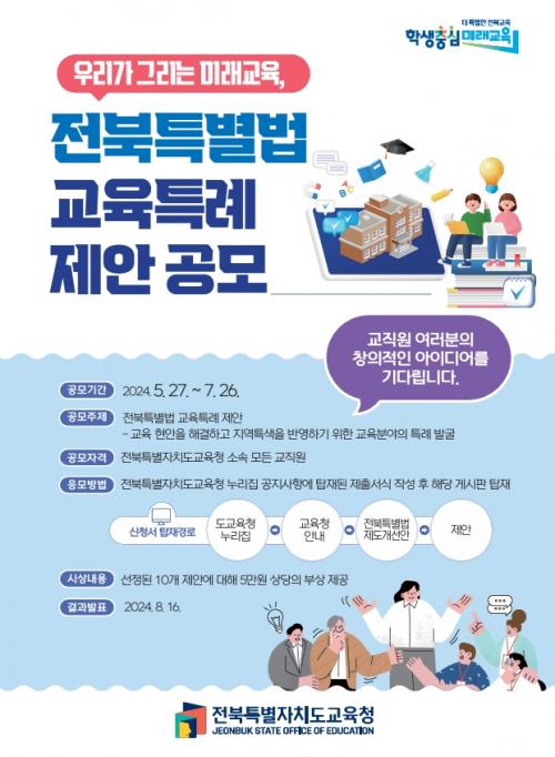 ÀÌ¿¡ ÀüºÏ±³À°Ã»Àº ±³À°Æ¯·Ê Á¦¾È °ø¸ðÀüÀ» ¿À´Â 7¿ù 26ÀϱîÁö ¸ðµç ¼Ò¼Ó±â°ü ±³Á÷¿øÀ» ´ë»óÀ¸·Î ÁøÇàÇÑ´Ù.