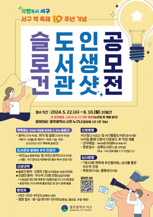 À̹ø °ø¸ðÀüÀº ½½·Î°Ç °ø¸ð¿Í µµ¼­°ü Àλý¼¦ °ø¸ð·Î ³ª´µ¾î ÁøÇàµÈ´Ù. ½½·Î°Ç °ø¸ð´Â Ã¥ÃàÁ¦ÀÇ °¡Ä¡¿Í ¿ªÇÒÀ» ´ãÀº 15ÀÚ À̳»ÀÇ °£°áÇϰí ÇÔÃàÀûÀΠǥ¾î¸¦ Á¢¼ö¹Þ°í, Àλý¼¦ °ø¸ð´Â ¼­±¸ °ü³» µµ¼­°ü¿¡¼­ Çà»ç․µ¶¼­․µµ¼­°ü Àü°æ µîÀ» ÂïÀº Ãß¾ï»çÁøÀ» »Ì´Â´Ù.