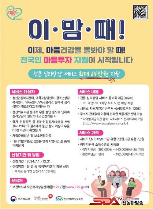 ½É¸®»ó´ã ¼ºñ½º Á¦°ø±â°üÀº 6¿ù ÇöÀç ¸ðÁý‧µî·Ï ÁßÀÌ´Ù. ½ÅûÀº ½Ã¼³, Àη µî ÀڰݱâÁØÀ» °®Ãá Á¦°ø±â°üÀÇ ÀåÀÌ »ç¾÷Àå ¼ÒÀçÁö °üÇÒ º¸°Ç¼Ò·Î Á÷Á¢ ¹æ¹® Á¢¼öÇÏ¸é µÈ´Ù. ±¸ºñ¼·ù µî ÀÚ¼¼ÇÑ »çÇ×Àº µµºÀ±¸ ´©¸®Áý¿¡¼ È®ÀÎÇÒ ¼ö ÀÖ´Ù.