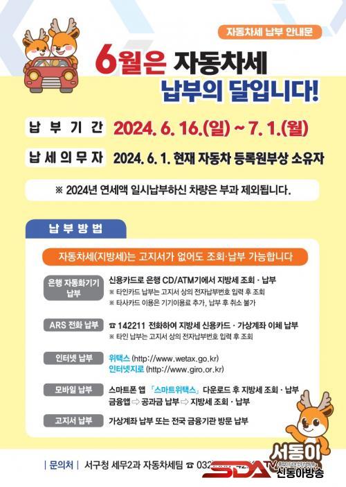 ³³ºÎ ±âÇÑÀº 7¿ù 1ÀϱîÁöÀÌ´Ù. ÀÚµ¿Â÷¼¼ ³³ºÎ´Â °íÁö¼°¡ ¾øÀ̵µ °¡´ÉÇÏ´Ù. Àü±¹ ±ÝÀ¶±â°ü ¹æ¹® CD/ATM(Çö±ÝÀÚµ¿ÀÔÃâ±â) Á¶È¸ ³³ºÎ, ARS(¢Ï142211) ÀüÈ ³³ºÎ, ÀÎÅͳݻçÀÌÆ® À§Åýº(www.wetax.go.kr), ÀÎÅͳÝÁö·Î(www.giro.or.kr)¿¡¼ Á¶È¸ ³³ºÎ, ½º¸¶Æ®À§Åýº(¾Û)¸¦ ÅëÇÑ ¸ð¹ÙÀϳ³ºÎ°¡ °¡´ÉÇÏ´Ù. ŸÀÎÄ«µå·Î ³³ºÎÇÒ °æ¿ì °íÁö¼¿¡ ±âÀçµÈ ÀüÀÚ³³ºÎ¹øÈ£¸¦ Á¶È¸ÇØ ³³ºÎÇÏ¸é µÈ´Ù.