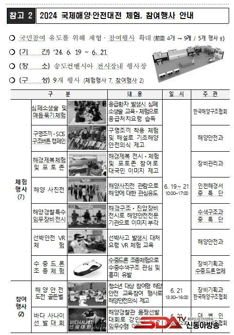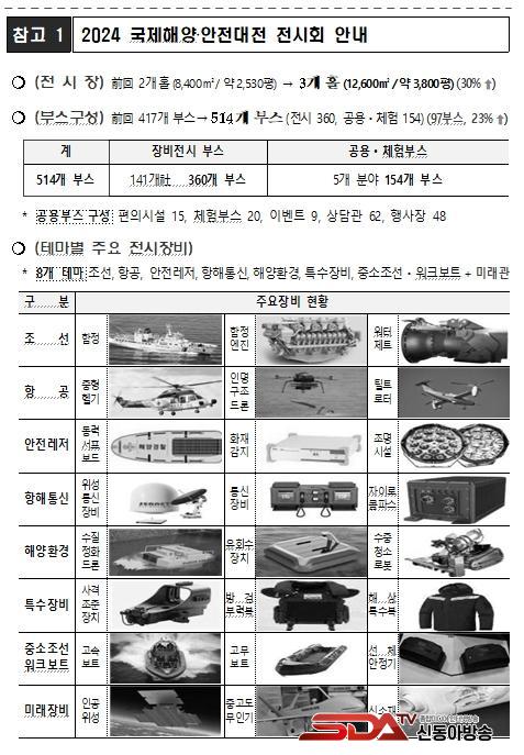 ƯÈ÷, ¿ÃÇØ Àü½Ãȸ´Â Á¶¼±, Ç×°ø, ¾ÈÀü¡¤·¹Àú, Ç×ÇØÅë½ÅÀåºñ, Ư¼öÀåºñ, ÇØ¾çȯ°æ, Áß¼ÒÁ¶¼±¡¤¿öÅ©º¸Æ®, ¹Ì·¡°ü ÁÖÁ¦·Î ±¸¼ºµÈ Å׸¶°üÀ¸·Î ´Ù¾çÇÑ Àåºñ¸¦ Àü½ÃÇÑ´Ù. À̹ۿ¡µµ ±¹¹ÎµéÀÌ Âü¿©ÇÒ ¼ö ÀÖ´Â ÇÁ·Î±×·¥ÀÎ Ãë¾÷¼³¸íȸ, ÇØ¾ç°æÂû Á¦º¹ ¹× ±¸¸íÁ¶³¢ Âø¿ë, ½ÉÆó¼Ò»ý¼ú üÇè, ¼±¹Ú¾ÈÀü VR üÇè µîÀ» ¿î¿µÇϸç, ¿ÃÇØ ÃÖÃÊ·Î °­ÀÎÇÑ Ã¼·Â°ú °Ç°­ÇÑ ½Åü¸¦ °¡Áö°í ±¹¹ÎÀÇ »ý¸íÀ» ÁöŰ´Â ÇØ¾ç°æÂû°üÀ» ¼±¹ßÇÏ´Â ¡®¹Ù´Ù»ç³ªÀÌ ¼±¹ß´ëȸ¡¯¿Í 6³â ¸¸¿¡ °³ÃÖÇϴ û¼Ò³âÀ» À§ÇÑ ¡°Çؾç¾ÈÀü µµÀü°ñµçº§¡± µî ±¹¹Îµé¿¡°Ô ´Ù¾çÇÑ º¼°Å¸®, Âü¿© °Å¸®¸¦ Á¦°øÇÑ´Ù.