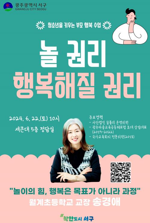 ¼±¸´Â ¿À´Â 22ÀÏ ¼¼Å«´ë(¼±¸ °æ¿·Î 28) 5Ãþ Á¤´ã½Ç¿¡¼ ¿ù°èÃʵîÇб³ ±³ÀåÀÌÀÚ (»ç)²ÞƲ¸® ¿î¿µÀ§¿øÀÎ ¼Û°æ¾Ö °»ç¸¦ ÃÊÃ»ÇØ ¡®³î ±Ç¸®, Çàº¹ÇØÁú ±Ç¸®¡¯¸¦ ÁÖÁ¦·Î ±³À°À» ÁøÇàÇÑ´Ù. ¼Û °»ç´Â À̳¯ ³îÀÌÀÇ Èû°ú ÇູÀº ¸ñÇ¥°¡ ¾Æ´Ï¶ó °úÁ¤À̶ó´Â °æÇè´ãÀ» Ç®¾î³¾ ¿¹Á¤ÀÌ´Ù.