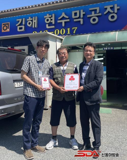 ÇöÆÇ Àü´Þ½Ä¿¡´Â (Àç)±èÇØ½Ãº¹ÁöÀç´Ü ±è¿µÈ£ °æ¿µÁö¿øº»ºÎÀå, ÀÌÇöµ¿ ±èÇØ½Ãû¼Ò³â¼ö·Ã°üÀåÀÌ Âü¼®ÇÏ¿© ÇöÆÇ Àü´Þ°ú ÇÔ²² °¨»ç Àλ縦 ÀüÇß´Ù.