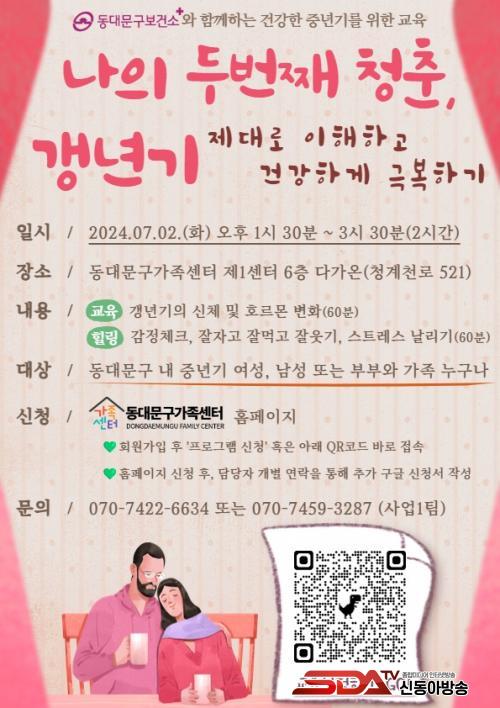 µ¿´ë¹®±¸ º¸°Ç¼Ò¿¡¼´Â °»³â±â¸¦ ½½±â·Ó°í °Ç°ÇÏ°Ô À̰ܳ¾ ¼ö ÀÖµµ·Ï µ¿´ë¹®±¸ °¡Á·¼¾ÅÍ¿Í Çù·ÂÇÏ¿© À̹ø °ÀǸ¦ ÁغñÇß´Ù. °ÀÇ´Â °»³â±â Áõ»óÀ» °Þ´Â Àå³âÃþ°ú ±× °¡Á·À» ´ë»óÀ¸·Î Çϸç, µ¿´ë¹®±¸ °¡Á·¼¾ÅÍ¿¡¼ 7¿ù 2ÀÏ(È) ¿ÀÈÄ 1½Ã 30ºÐºÎÅÍ 2½Ã°£ µ¿¾È ÁøÇàµÈ´Ù.