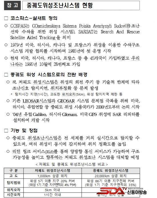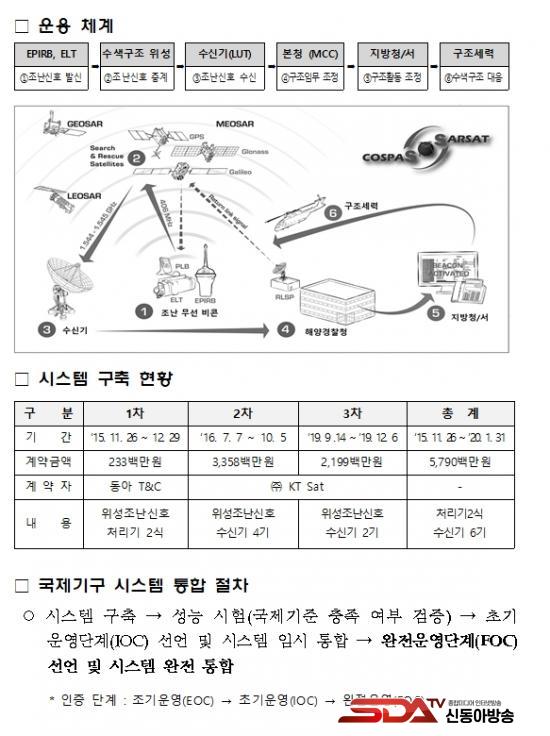 ÇØ¾ç°æÂûû À§¼º Á¶³½Ã½ºÅÛÀº ¼±¹Ú°ú Ç×°ø±â µî¿¡¼ Á¶³»óȲ ¹ß»ý ½Ã ºñÄÜ(EPIRB, ELT µî) Àåºñ¸¦ ÀÌ¿ëÇÏ¿© Á¶³½ÅÈ£¸¦ ¹ß½ÅÇϸé À§¼ºÀÇ Áß°è·Î Áö»ó¼³ºñ¸¦ ÀÌ¿ëÇÏ¿© ¼ö½ÅÇÏ´Â ½Ã½ºÅÛÀ¸·Î Áö³ ¾à 30³â°£ Àú±ËµµÀ§¼ºÀ» ÀÌ¿ëÇÑ ½Ã½ºÅÛÀÌ »ç¿ëµÇ¾ú´Ù.