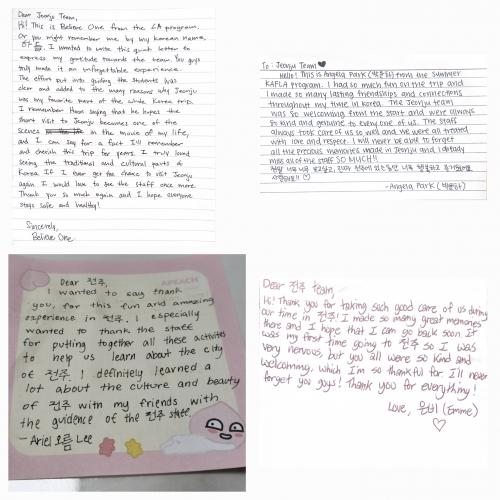 ÇÑ ÇлýÀº ¼ÕÆíÁö¸¦ ÅëÇØ ¡°ÀüÁÖ¸¦ ¹æ¹®ÇÑ °æÇèÀº ³» »îÀÇ ¿µÈ °°Àº Àå¸é Áß Çϳª·Î ±â¾ïµÉ °ÍÀ̰í, ´Ù½Ã Çѹø ÀüÁÖ¸¦ ¹æ¹®ÇÏ°í ½Í´Ù¡±¸ç ¡°ÇÁ·Î±×·¥À» ±âÈ¹ÇØÁֽŠÀüÁֽà Á÷¿øºÐµé¿¡°Ô °¨»çÀÇ ¸»¾¸À» ÀüÇÏ°í ½Í´Ù¡±°í ÀüÇß´Ù. ´Ù¸¥ Çлýµéµµ ¡°ÀüÁÖ ²É½Éµµ¼°ü¿¡¼ ¿¼è°í¸®¸¦ ¸¸µé°í, ±âŸµµ Ã帰í, ¿©·¯ °¡Áö¸¦ ¸¸µé¾ú´ø ÀüÁÖ¿¡¼ÀÇ ½Ã°£ÀÌ Á¤¸» ÁÁ¾Ò´Ù¡±, ¡°Áñ°Å¿ü´ø ÀüÁÖ¸¦ µû¶æÇϰí Ä£ÀýÇÑ µµ½Ã·Î ±â¾ïÇÒ °ÍÀÌ´Ù¡± µî ¸¹Àº À̾߱⸦ ½á³»·Á °¬´Ù.