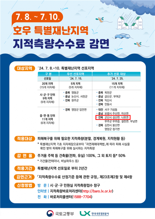 ÁöÀûÃø·® ¼ö¼ö·á °¨¸é Á¶Ä¡´Â ÁýÁßÈ£¿ì·Î ÁÖ°Å¿ë °Ç¹°ÀÌ ÀüÆÄ ¶Ç´Â À¯½ÇµÇ´Â µî ÇÇÇØ¸¦ ÀÔÀº ÁÖ¹ÎÀÌ ÁÖÅà ½ÅÃàÀ̳ª º¹±¸ µîÀ» À§ÇØ ¼Ò¿äµÇ´Â ÁöÀûÃø·®¼ö¼ö·á¸¦ °¨¸éÇØÁÖ°íÀÚ ±¹Åä±³ÅëºÎ ½ÂÀÎÀ» ¹Þ¾Æ ¸¶·ÃµÆ´Ù.