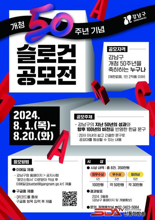 °ø¸ðÀü¿¡´Â ´©±¸³ª Âü¿©ÇÒ ¼ö ÀÖÀ¸¸ç 1ÀÎ 2ÀÛǰ±îÁö ³¾ ¼ö ÀÖ´Ù. ½½·Î°ÇÀº 20ÀÚ À̳»ÀÇ ½±°í °£°áÇÑ ÇÑ±Û ¹®±¸·Î °³²±¸ °³Ã» 50ÁÖ³âÀ» ±â³äÇÏ¸é¼ °ø°¨´ë¸¦ Çü¼ºÇÒ ¼ö ÀÖ´Â ³»¿ëÀ̾î¾ß ÇÑ´Ù. ±¸Ã» ȨÆäÀÌÁöÀÇ °øÁö»çÇ׿¡¼ ½Åû¼¸¦ ³»·Á¹Þ¾Æ À̸ÞÀÏ(jbluebell@gangnam.go.kr)·Î Á¦ÃâÇϰųª Æ÷½ºÅÍ¿¡ ÀÖ´Â QRÄڵ忡 Á¢¼ÓÇØ ±¸±ÛÆûÀ¸·Î ÀÀ¸ðÇÏ¸é µÈ´Ù.