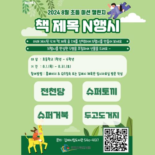 À̹ø 8¿ù 1ÀϺÎÅÍ 31ÀϱîÁö ÁøÇàµÇ´Â ÃÊµî ¹Ì¼Ç Ã§¸°Áö´Â ¡®Ã¥ Á¦¸ñ NÇà½Ã¡¯·Î ¡®Àüõ´ç¡¯, ¡®½´ÆÛÅä³¢¡¯, ¡®½´ÆÛ°ÅºÏ¡¯, ¡®µÎ°íµµ°ÅÁö¡¯·Î ±¸¼ºµÈ ÃÑ 4°¡Áö Á¦¸ñ Áß ÇÑ °¡Áö¸¦ °ñ¶ó NÇà½Ã¸¦ ÀÛ¼ºÇÏ¸é µÈ´Ù.