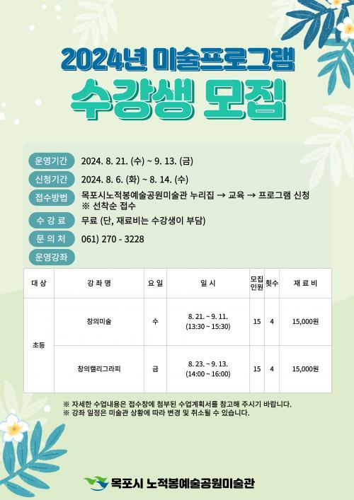 [½Åµ¿¾Æ¹æ¼Û=±è±¤½Ä±âÀÚ] ¸ñÆ÷½Ã ³ëÀûºÀ¿¹¼ú°ø¿ø¹Ì¼ú°üÀÌ ¿À´Â 21ÀϺÎÅÍ 9¿ù 13ÀϱîÁö ÃʵîÇлýÀ» ´ë»óÀ¸·Î ¹Ì¼úÇÁ·Î±×·¥À» ¿î¿µÇÑ´Ù.