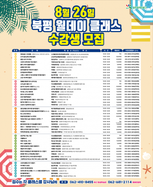 [½Åµ¿¾Æ¹æ¼Û=±èÀçÂù±âÀÚ] ±¤Áֽà ºÏ±¸(±¸Ã»Àå ¹®ÀÎ)°¡ ¿À´Â 26ÀÏ ¿ÀÀü 10½ÃºÎÅÍ ¿ÀÈÄ 9½Ã±îÁö Æò»ýÇнÀ Á¾ÇÕ Ã¼ÇèÀÇ Àå ¡®ºÏÆò-¿ùµ¥ÀÌŬ·¡½º¡¯ 8¿ù ÇÁ·Î±×·¥À» ¿î¿µÇÑ´Ù°í 19ÀÏ ¹àÇû´Ù.