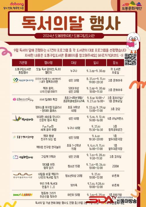 °¢ µµ¼­°ü¿¡¼­ ¼±Á¤ÇÑ ´ëÇ¥ ÇÁ·Î±×·¥À» »ìÆìº¸¸é ´ÙÀ½°ú °°´Ù. ¡ãµµºÀ¹®È­Á¤º¸µµ¼­°ü ¡®³»°¡ ÇູÇÏ·Á¸é¡¯(8¿ù 21ÀÏ~9¿ù 11ÀÏ) ¡ãµµºÀ¾ÆÀ̳ª¶óµµ¼­°ü ¡®»ç¼­ ¸±·¹ÀÌ Æ¯°­¡¯(9¿ù 8ÀÏ, 27ÀÏ) ¡ãÇи¶À»µµ¼­°ü ¡®À§´ëÇÑ ¼¼»óÀ» ¸¸³ª´Ù: Àι®ÇÐ ¸í»ç Ư°­(9¿ù 5ÀÏ, 12ÀÏ) ¡ãµµºÀ±âÀûÀǵµ¼­°ü ¡®Ã¥°ú Æò»ý Ä£±¸°¡ µÇ´Â ¹ý¡¯(9¿ù 6ÀÏ) ¡ã½Ö¹®Ã¤¿òµµ¼­°ü ¡®±×¸²Ã¥ ±âȹÀÚ¡¯(9¿ù 7ÀÏ~28ÀÏ) ¡ã¿ø´ç¸¶À»ÇÑ¿Áµµ¼­°ü ¡®³»ÀÏÀ» ¹Ù²Ü Ã¥Àбâ: ³ª¸¸ÀÇ µ¶¼­¹ý ã±â¡¯(9¿ù 21ÀÏ) ¡ãµÑ¸®µµ¼­°ü ¡®À̼ø½ÅÀ» ã¾Æ¶ó¡¯(9¿ù 1ÀÏ~29ÀÏ).