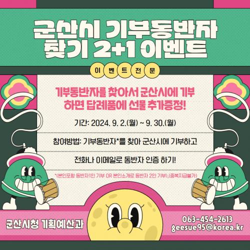 À̹ø Çà»ç´Â ±âºÎµ¿¹ÝÀÚ¸¦ ã¾Æ ±º»ê½Ã¿¡ °íÇâ»ç¶û±âºÎ¸¦ Çϸé Âü¿©ÀÚ Áß ÇÑ ¸í¿¡°Ô Ãß°¡ ¼±¹°ÀÌ Á¦°øµÇ´Â Çü½ÄÀ¸·Î ¡ãÂü¿©ÀÚ º»Àΰú µ¿¹ÝÀÚ 1ÀÎÀÌ ÇÔ²² ±âºÎ ¡ãÂü¿©ÀÚ º»ÀÎÀº ±âºÎÇÏÁö ¾Ê´õ¶óµµ ¼Ò°³·Î ¿Â µ¿¹ÝÀÚ 2ÀÎÀÌ ¸ðµÎ ±âºÎÇÏ¸é µÈ´Ù.