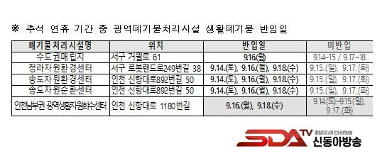 ÀÎõ½Ã´Â ¿¬ÈÞ ±â°£ »ýȰ¾²·¹±â ÀûÀç·Î ÀÎÇÑ ½Ã¹Î ºÒÆíÀ» ÃÖ¼ÒÈÇϱâ À§ÇØ, ±º¡¤±¸¿¡¼ ¹ÝÀÔÇÏ´Â »ýȰ¾²·¹±âÀÇ ±¤¿ªÆó±â¹°Ã³¸®½Ã¼³ ¹ÝÀÔ ÀÏÁ¤À» º°µµ·Î ÁöÁ¤ÇÏ¿© ¿î¿µÇÒ ¿¹Á¤ÀÌ´Ù. ¼Ûµµ¿Í û¶ó ¼Ò°¢½Ã¼³Àº 9¿ù 15ÀÏ(ÀÏ¿äÀÏ)°ú 9¿ù 17ÀÏ(Ãß¼® ´çÀÏ)À» Á¦¿ÜÇÑ ¿¬ÈÞ ±â°£ ³»³» °¡µ¿µÇ¸ç, ¼öµµ±Ç¸Å¸³Áöµµ 9¿ù 16ÀÏ¿¡´Â ¹ÝÀÔÀÌ Çã¿ëµÈ´Ù.