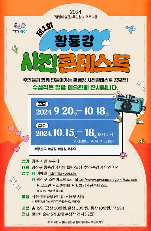 Á¦1ȸ Ȳ·æ°­ »çÁø ÄÜÅ×½ºÆ®´Â ±¤»ê±¸ Ȳ·æ°­¿¡¼­ÀÇ ¡âÈú¸µ ¡âÀÏ»ó ¡âÃß¾ï ¡âdz°æÀÌ ´ã±ä »çÁøÀ» ÁÖÁ¦·Î ±¤ÁÖ ½Ã¹Î ´©±¸³ª Âü¿©ÇÒ ¼ö ÀÖ´Ù.