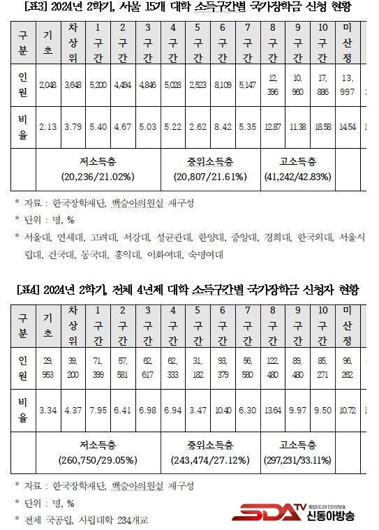 ±¹È¸ ±³À°À§¿øÈ¸ ¹é½Â¾Æ ÀÇ¿ø(´õºÒ¾î¹ÎÁÖ´ç)ÀÌ Çѱ¹ÀåÇÐÀç´ÜÀ¸·ÎºÎÅÍ Á¦Ãâ¹ÞÀº ±¹Á¤°¨»ç ÀÚ·á ¡®2024³â 2Çб⠴ëÇк° ±¹°¡ÀåÇÐ±Ý 1À¯Çü ½ÅûÀÚ ÇöȲ¡¯À» ºÐ¼®ÇÑ °á°ú, ±¹°¡ÀåÇÐ±Ý 1À¯ÇüÀ» ½ÅûÇÑ Àüü ¼­¿ï´ë ÀçÇÐÀοø 6,641¸í Áß Àý¹Ý ÀÌ»óÀÎ 3,507¸í(52.81%)ÀÌ °í¼ÒµæÃþ ÇлýÀÎ °ÍÀ¸·Î µå·¯³µ´Ù. Àú¼ÒµæÃþ ÇлýÀº 1,214¸í(18.28%)À¸·Î, °í¼ÒµæÃþ ÇлýÀÇ ¼ö´Â Àú¼ÒµæÃþ ÇлýÀÇ ¼öº¸´Ù ¾à 3¹è ´õ ¸¹¾Ò´Ù.