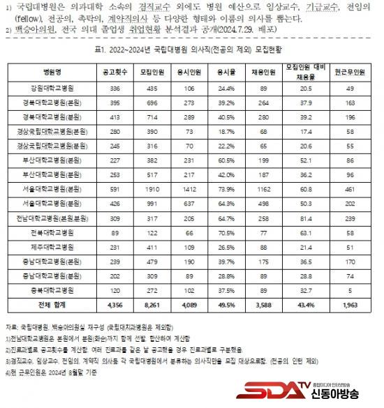 ¡à ´õºÒ¾î¹ÎÁÖ´ç ¹é½Â¾ÆÀÇ¿ø(±¹È¸ ±³À°À§¿øÈ¸)ÀÌ Àü±¹ ±¹¸³´ëº´¿øÀÇ ÃÖ±Ù 3³â°£ ÀÇ»çÁ÷(Àü°øÀÇ Á¦¿Ü) ¸ðÁýÇöȲ ÀڷḦ ¹Þ¾Æ ºÐ¼®ÇÑ °á°ú, 2022³âºÎÅÍ 2024³â 8¿ù ¸»±îÁö ÃÑ 4,356ȸ¿¡ °ÉÃÄ 8,261¸íÀÇ ÀÇ»çÁ÷ ¸ðÁý°ø°í¸¦ ³ÂÀ¸³ª ÃÑ ÀÀ½ÃÀοø 4,089¸í, ÀÀ½ÃÀ²Àº 49.5%¿¡ ±×ÃÆ´Ù. ÀÌÁß º´¿ø¿¡ ä¿ëµÈ ÀÇ»ç´Â 3,588¸íÀ̾úÁö¸¸, ÇöÀç±îÁö ±Ù¹«Çϰí ÀÖ´Â ÀÇ»ç´Â 1,963¸í¿¡ ºÒ°úÇØ, ÀÇ»ç ¸ðÁý¿¡ ¾î·Á¿òÀ» °Þ´Â ±¹¸³´ëº´¿øÀÌ Áö¼ÓÇØ¼ ÀÇ»ç ºÎÁ·¿¡ ½Ã´Þ¸®°í ÀÖ´Â °ÍÀ¸·Î ³ªÅ¸³µ´Ù. (Ç¥1)