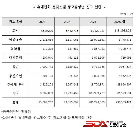 ¡à ±¹È¸ ¿©¼º°¡Á·À§¿øÈ¸ ¹é½Â¾Æ ÀÇ¿ø(´õºÒ¾î¹ÎÁÖ´ç)ÀÌ Çѱ¹ÀÎÅͳÝÁøÈï¿ø¿¡¼­ Á¦Ãâ¹ÞÀº ¡®ÈÞ´ëÀüÈ­ ¹®ÀÚ½ºÆÔ ±¤°íÀ¯Çüº° ½Å°í ÇöȲ¡¯¿¡ µû¸£¸é ºÒ¹ý ½ºÆÔ¹®ÀÚ´Â ÃÖ±Ù 4³â°£ ÃÑ 6¾ï 2,444¸¸°ÇÀ¸·Î ÃÖ±Ù ±Þ°ÝÈ÷ Áõ°¡Çß´Ù. ¿¬µµº°·Î 2021³â 1,900¸¸°Ç, 2022³â 2,400¸¸°ÇÀ̰í 2023³âÀº 2021³âº¸´Ù ¾à 15¹è Áõ°¡ÇÑ 2¾ï 8,500¸¸°ÇÀÌ´Ù. ¿ÃÇØÀÇ °æ¿ì 9¿ù ±âÁØ 2¾ï 9,500¸¸°ÇÀ¸·Î ÀÌ¹Ì À۳⠰Ǽö¸¦ ³Ñ¾î¼¹´Ù.