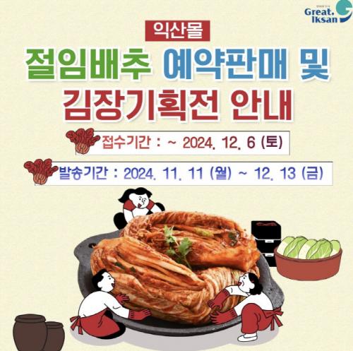 8ÀÏ ÀÍ»ê½Ã¿¡ µû¸£¸é 11¿ù 11ÀϺÎÅÍ 12¿ù 13ÀϱîÁö ÀÍ»ê¸ô(www.iksanmall.com)¿¡¼ ÀýÀÓ¹èÃ߸¦ ºñ·ÔÇØ Áö¿ª¿¡¼ »ý»êµÈ ½Å¼±ÇÑ ±èÀå Àç·á¸¦ ¸¸³ªº¼ ¼ö ÀÖ´Ù.