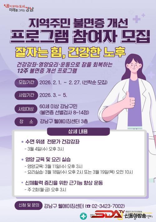 À̹ø »ç¾÷Àº ¼ö¸éÀ» ¡®Áõ»ó¡¯ÀÌ ¾Æ´Ï¶ó ¡®»ýȰ¡¯·Î °ü¸®ÇÏ´Â µ¥ ÃÊÁ¡À» ¸ÂÃè´Ù. °Ç°¡¤¿µ¾ç¡¤¿îµ¿À» ¿¬°èÇÑ ÅëÇÕ ÇÁ·Î±×·¥À¸·Î ±¸¼ºÇØ ¾î¸£½ÅµéÀÌ ¾ÈÀüÇϰí Áö¼Ó °¡´ÉÇÑ ¹æ½ÄÀ¸·Î ¼ö¸é °Ç°À» ȸº¹Çϵµ·Ï µ½´Â´Ù. Âü¿©ÀÚ´Â »çÀü ¼ö¸é ¼³¹® °Ë»ç¿¡¼ ºÒ¸éÁõ Áö¼ö 8~14Á¡(°æ°è¼º ºÒ¸é)À¸·Î È®ÀÎµÈ ´ë»óÀÚ °¡¿îµ¥ ¼±Á¤ÇÑ´Ù.